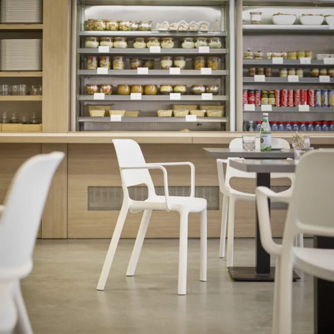Ez a modell karfákkal egészül ki, amelyek nemcsak esztétikai szempontból hangsúlyosak, de kényelmi funkciót is betöltenek: extra támaszt nyújtanak hosszabb ülések során, legyen szó váróteremről, teraszról vagy tárgyalóról. A letisztult formavilág és az egydarabos kialakítás praktikumot is hordoz, hiszen a szék rakásolható, így helytakarékosan tárolható vagy szállítható – padlón akár öt, szállítókocsin tíz darab is egymásra helyezhető.